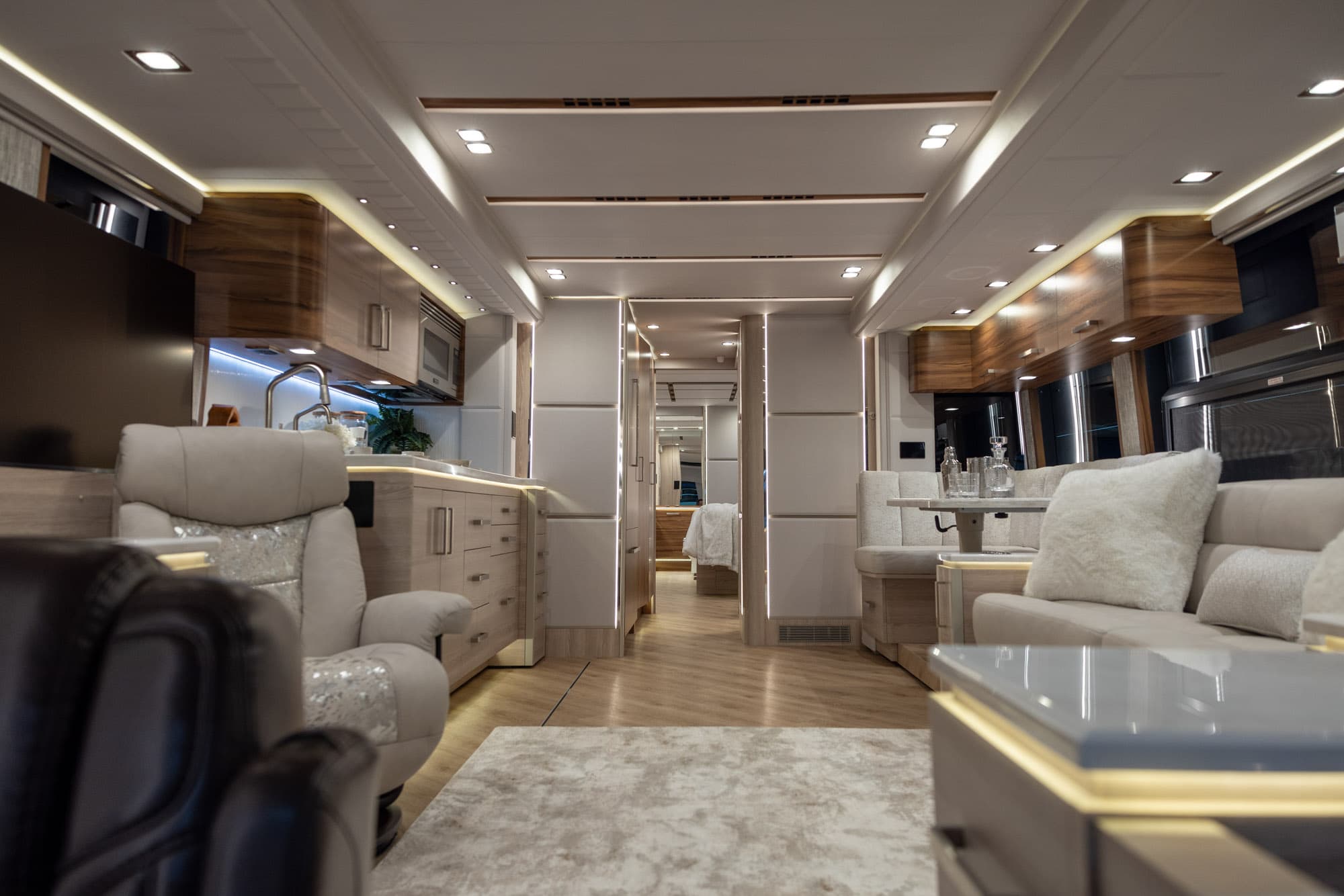 The galley gets full-sized refrigerators, high-end washer/dryers, solid-surface counters, and the kind of storage solutions that Outlaw perfected over two decades of fitting living spaces into constrained volumes. State-of-the-art LED lighting runs throughout—multiple zones, multiple sources, ambient options for different moods.